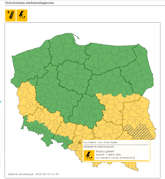 Ostrzeżenie IMGW dla woj. śląskiego obowiązuje 19 czerwca już od godz. 12 i będzie aktualne aż do północy. IMGW prognozuje wystąpienie burz z opadami deszczu miejscami od 20 mm do 30 mm oraz porywami wiatru do 70 km/h. Miejscami możliwy grad.