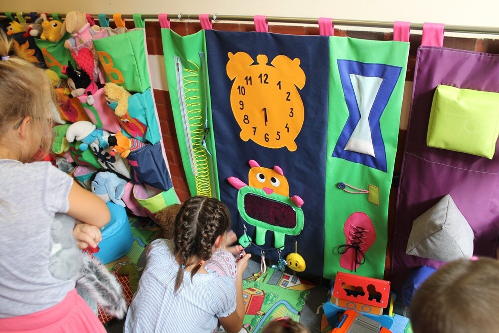Specjalnie przygotowany kącik dziecięcy, to przestrzeń, w której królować będą kolorowe, sensoryczne maty oraz wygodne, miękkie poduszki do siedzenia uszyte przez uczestników z grupy krawieckiej działającej w ramach Centrum.