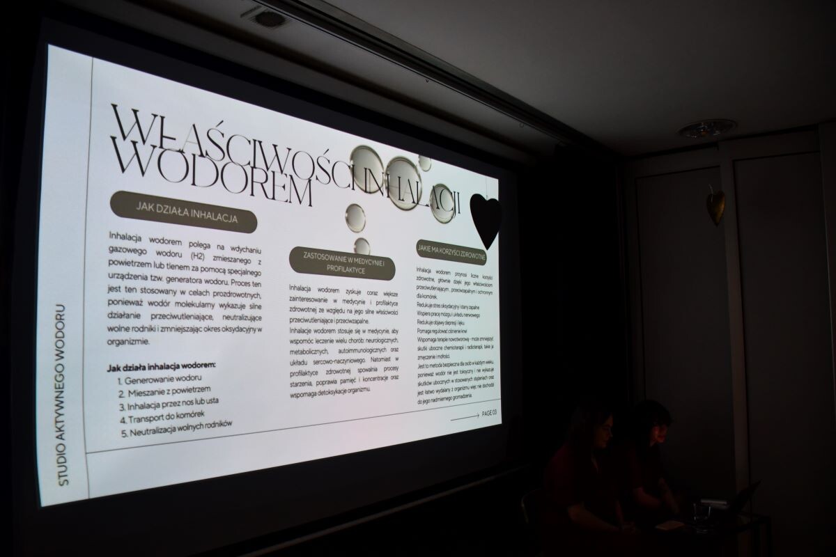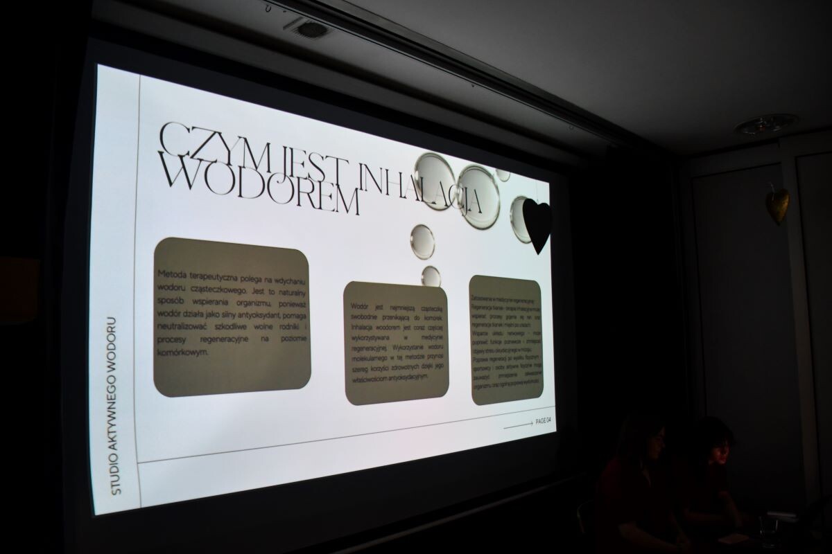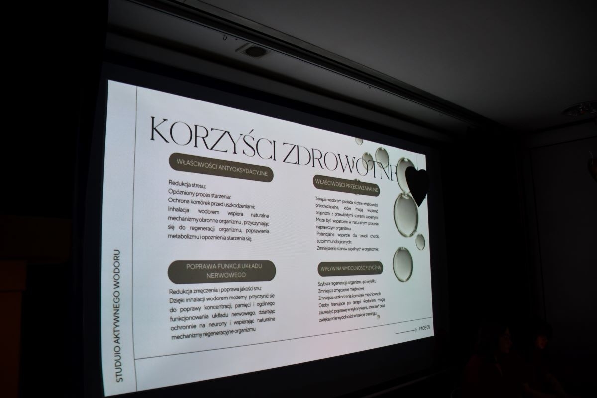 Inhalacja wodorem polega na wdychaniu gazowego wodoru (H2) zmieszanego z powietrzem lub tlenem za pomocą specjalnego urządzenia tzw. generatora wodoru. Proces ten jest wykorzystywany w celach prozdrowotnych, ponieważ wodór molekularny wykazuje silne działanie przeciwutleniające, neutralizujące wodne rodniki, a także zmniejsza okres oksydacyjny w organizmie. - mogliśmy przeczytać na wyświetlanej prezentacji.