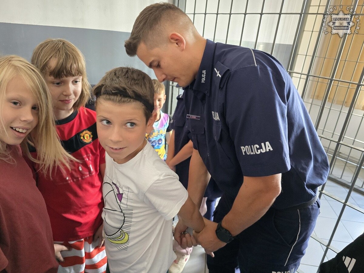 Dzieci miały także okazję zwiedzić komendę, zajrzeć do miejsc na co dzień niedostępnych dla osób postronnych, zobaczyć radiowóz policyjny oraz dowiedzieć się, jak wygląda codzienna praca funkcjonariuszy. Najmłodsi z dużym zainteresowaniem słuchali opowieści mundurowych i chętnie zadawali pytania.