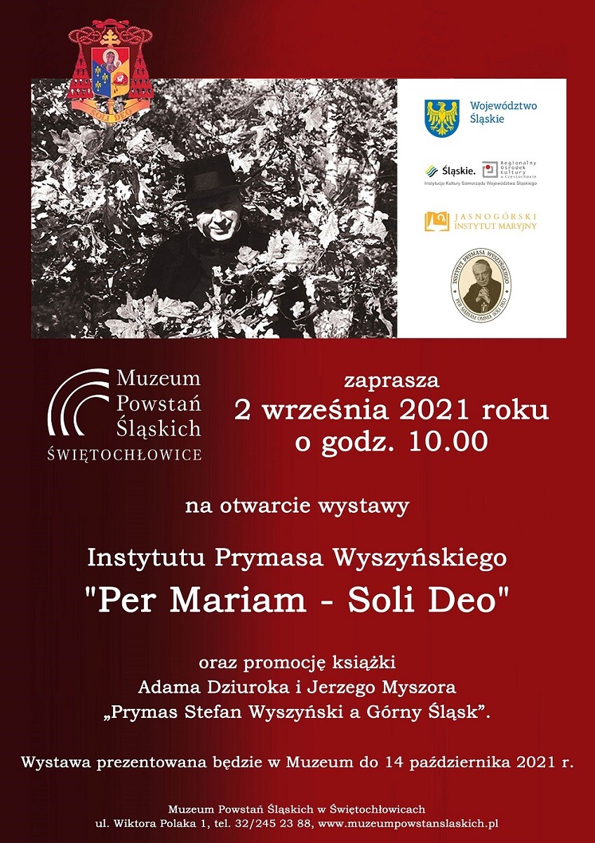 Muzeum Powstań Śląskich w Świętochłowicach zaprasza 2 września o godzinie 10:00 na otwarcie wystawy Instytutu Prymasa Wyszyńskiego "Per Mariam - Soli Deo". Jednocześnie przeprowadzana będzie promocja książki Adama Dziuroka i Jerzego Myszora "Prymas Stefan Wyszyński a Górny Śląsk".