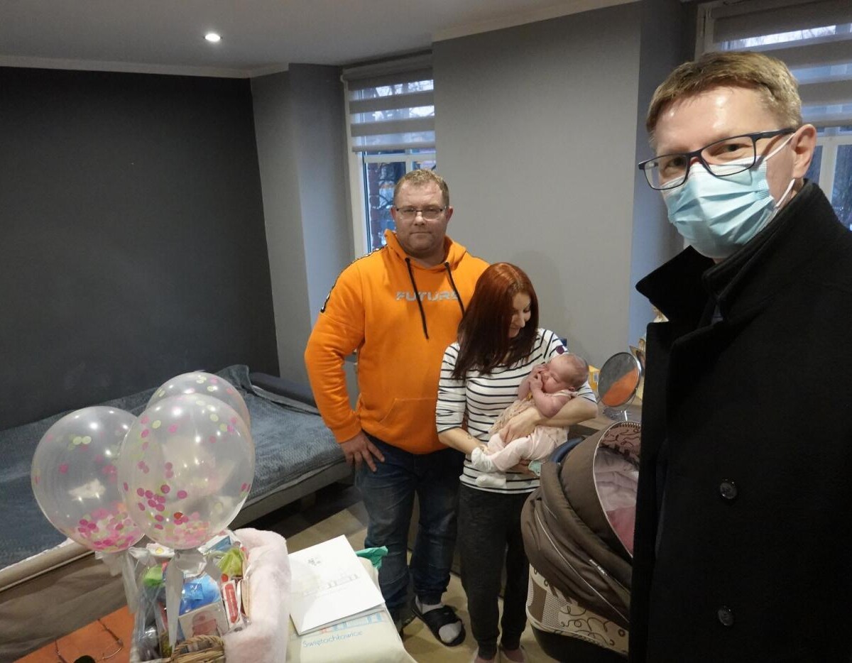 Oliwia Duma jest pierwszym dzieckiem ze Świętochłowic urodzonym w 2021 roku. Z prezentami odwiedził ją prezydent Świętochłowic, Daniel Beger.