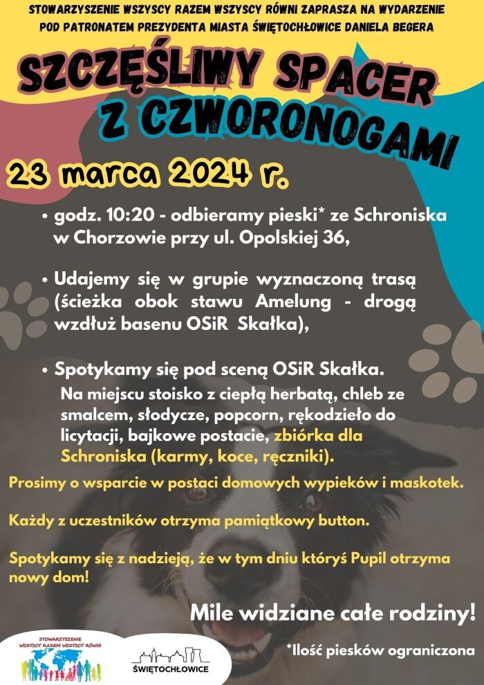 Wiosna oznacza jedno – czas na spacery! Stowarzyszenie Wszyscy Razem Wszyscy Równi wyszło z podobnego założenia, dlatego już 23 marca odbędzie się wydarzenie „Szczęśliwy spacer z czworonogami”. Każdy z nas będzie mógł zabrać na spacer psiaka ze Schroniska dla Bezdomnych Zwierząt w Chorzowie.