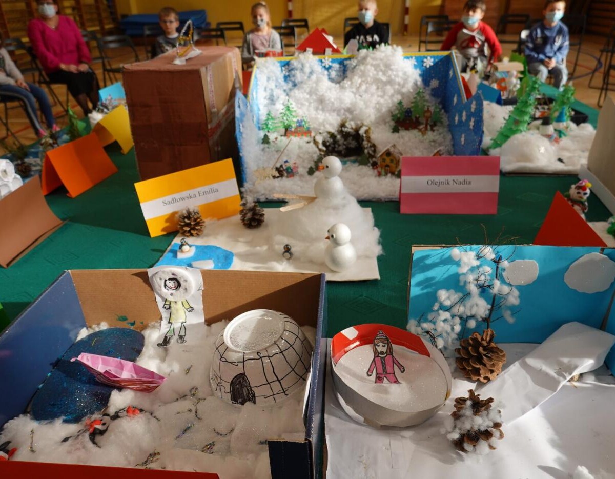 Uczniowie klas I–III wzięli udział w konkursie plastycznym „Zima wokół nas – makieta”. Technika wykonania prac była dowolna.