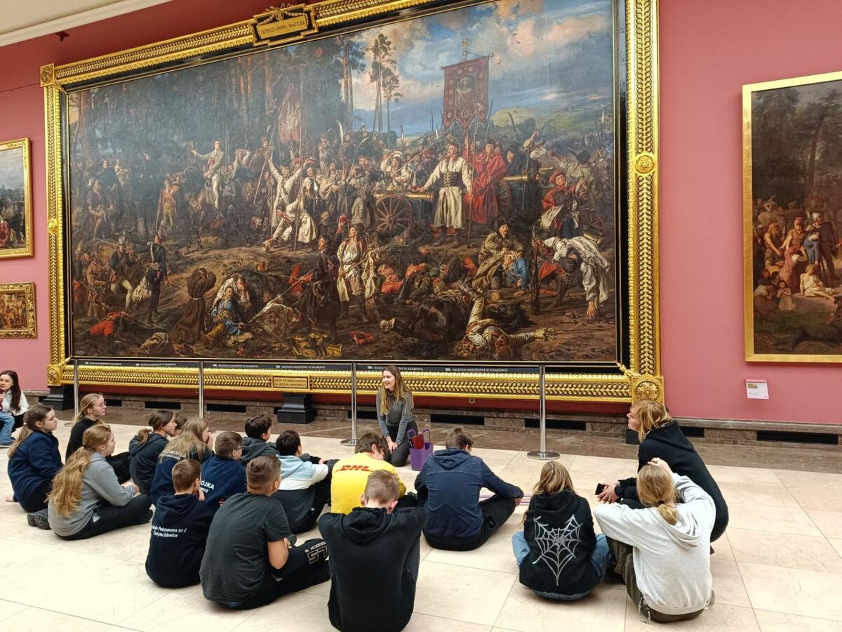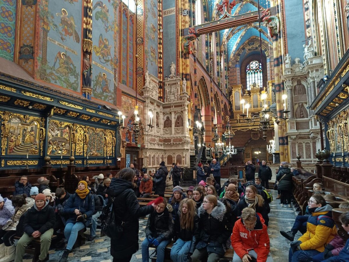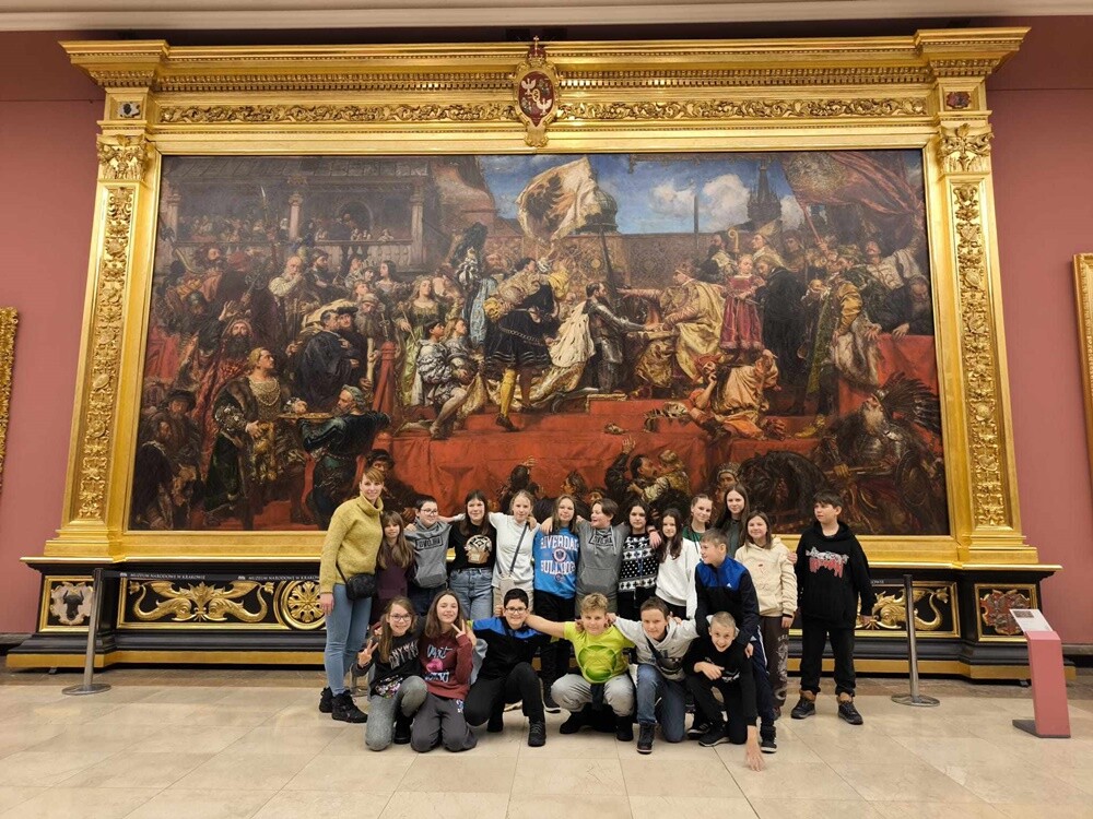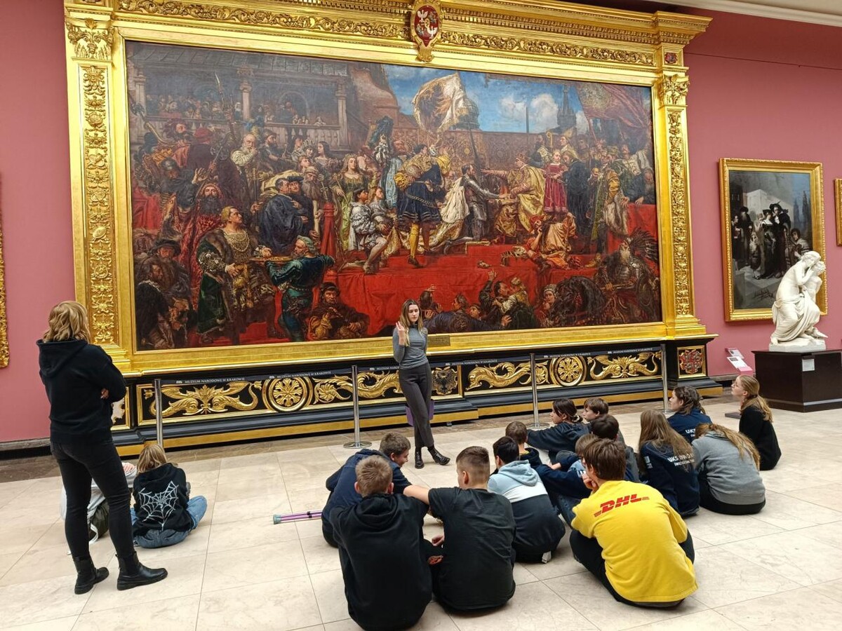 Pierwszą częścią wycieczki było zwiedzanie z przewodnikiem najważniejszych i najpiękniejszych zabytków, zgromadzonych wokół Rynku Głównego: Barbakanu, Collegium Maius, Sukiennic oraz Kościołów Franciszkanów i Mariackiego, z przepięknym ołtarzem Wita Stwosza. Następnie uczniowie udali się do Galerii Sztuki Polskie XIX Wieku w Sukiennicach na lekcje muzealne. Na uczniów klasy starszej czekali malarze, kronikarze historii Polski, a na młodszych warsztaty o krakowskich legendach.