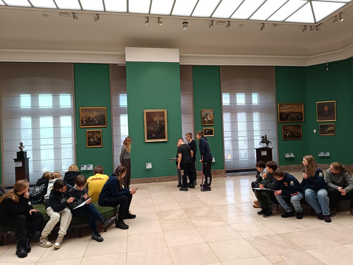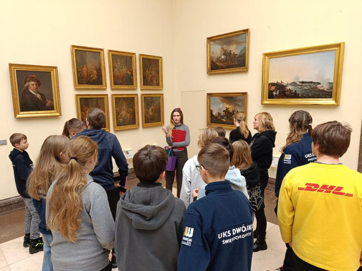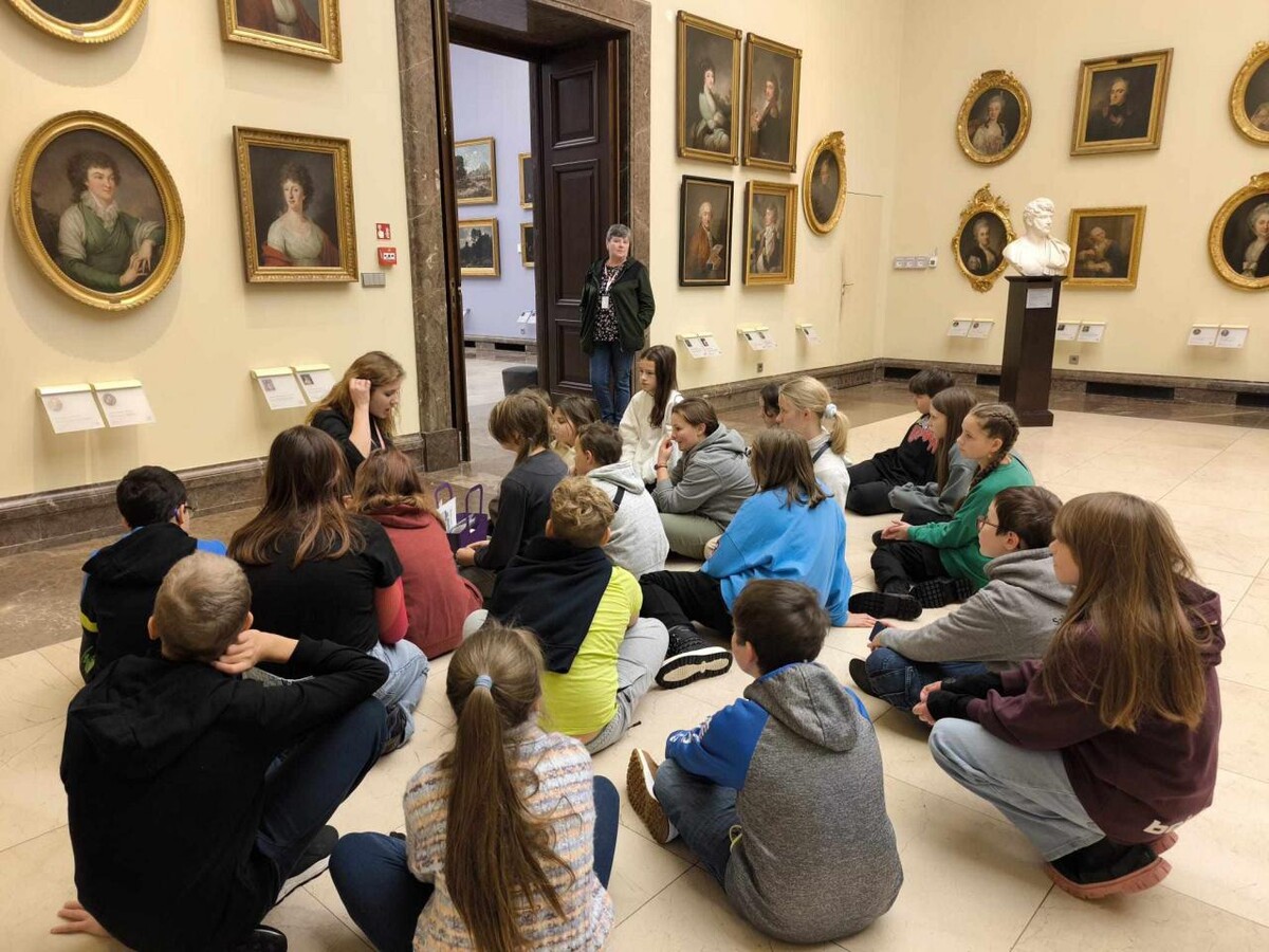 Pierwszą częścią wycieczki było zwiedzanie z przewodnikiem najważniejszych i najpiękniejszych zabytków, zgromadzonych wokół Rynku Głównego: Barbakanu, Collegium Maius, Sukiennic oraz Kościołów Franciszkanów i Mariackiego, z przepięknym ołtarzem Wita Stwosza. Następnie uczniowie udali się do Galerii Sztuki Polskie XIX Wieku w Sukiennicach na lekcje muzealne. Na uczniów klasy starszej czekali malarze, kronikarze historii Polski, a na młodszych warsztaty o krakowskich legendach.