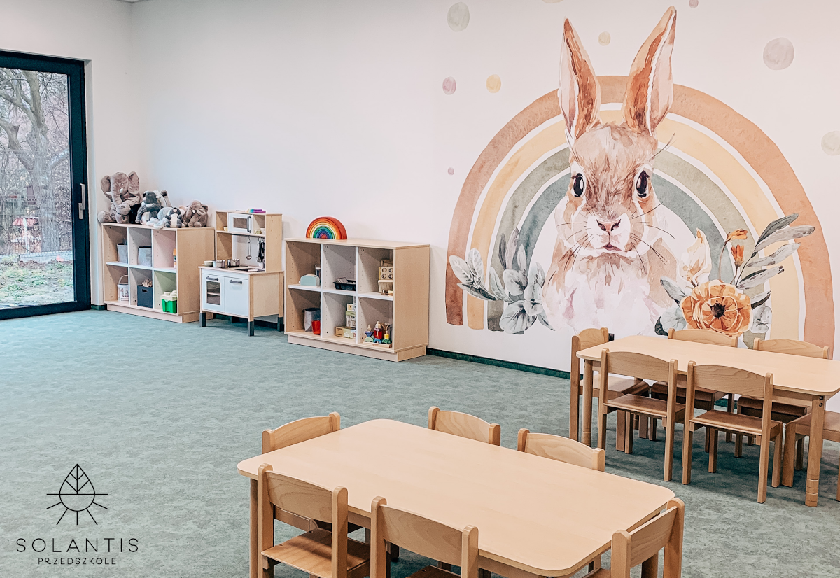 Ale przedszkole Solantis to również piękna, pastelowa przestrzeń. Na 600m2 stworzyliśmy 5-cio oddziałowe przedszkole i klub dziecięcy dla 125 dzieci utrzymane w minimalistycznej i skandynawskiej stylistyce. Postawiliśmy na głęboką więź i połączenie z naturą, która przez zielone tarasy czy ogród niemal wchodzi do naszego przedszkola. Minimalizm i spójność w wystroju przedszkola sprawia, że dzieci nie są przytłoczone i przebodźcowane kolorowymi postaciami straszącymi ze ścian sal. Pastelowe sygnatury leśnych zwierząt pobudzają dziecięcą wyobraźnie i dają przestrzeń na rozwój.