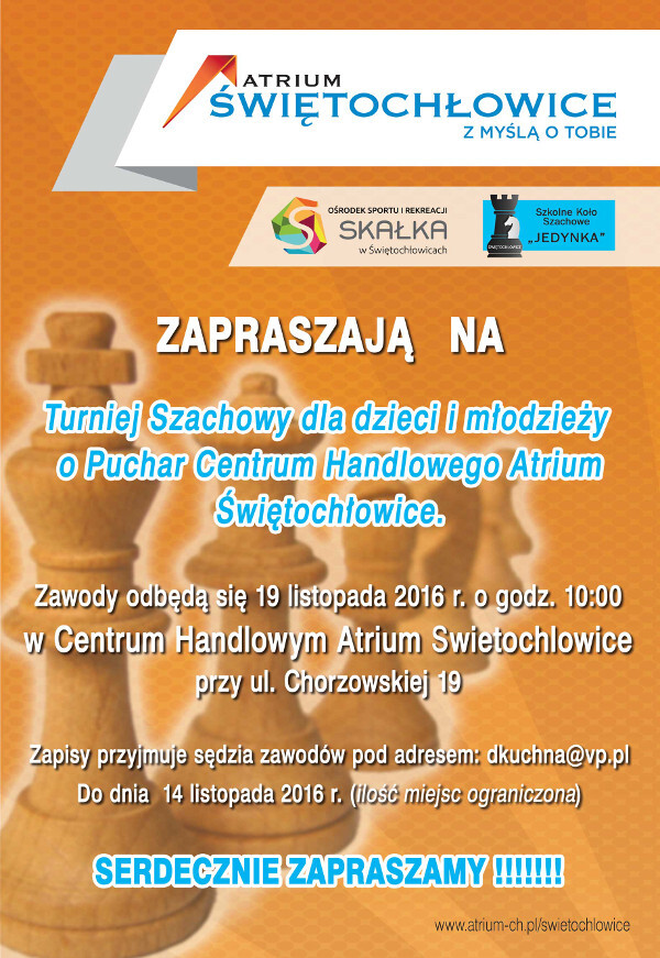 - Historia szachów liczy setki lat, a gra niezmiennie cieszy się popularnością. Pasją do niej warto zarażać zwłaszcza najmłodszych, ponieważ ta tzw. królewska gra znacząco wspomaga rozwój intelektualny dzieci i młodzieży. Z myślą o nich postanowiliśmy zorganizować w Atrium Świętochłowice turniej szachowy z prawdziwego zdarzenia. Serdecznie zapraszamy do udziału. Na uczestników czeka duża porcja emocji i dobrej zabawy! – mówi Klaudia Antonik-Kłopot, dyrektor Atrium Świętochłowice.