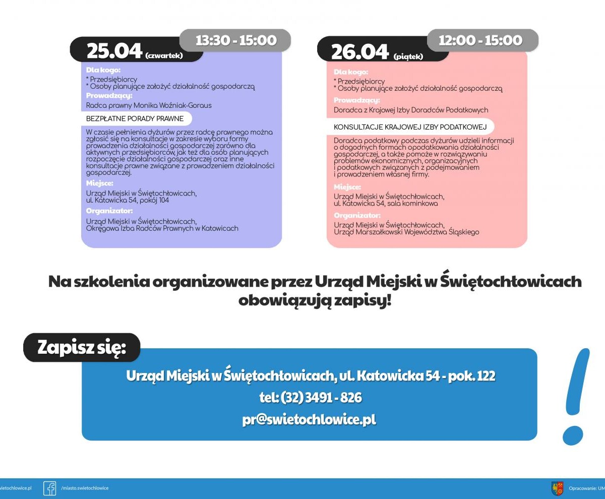 Zapisy są prowadzone w Urzędzie Miejskim w Świętochłowicach w pokoju 122, pod nr tel. 32 3491 826 lub mailowo pod adresem [email protected].