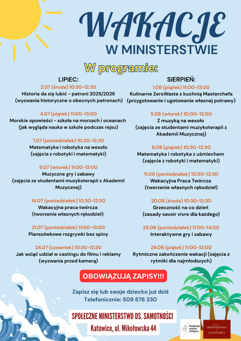 Nie macie jeszcze pomysłu na wakacje? A może wciąż szukacie ciekawych i kreatywnych zajęć dla dzieci i młodzieży? Już nie musicie! Władze miasta zapraszają do skorzystania z wakacyjnej oferty Społecznego Ministerstwa ds. Samotności.