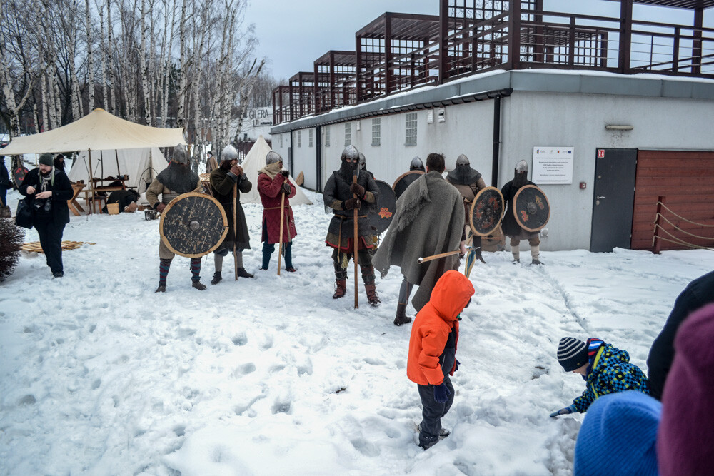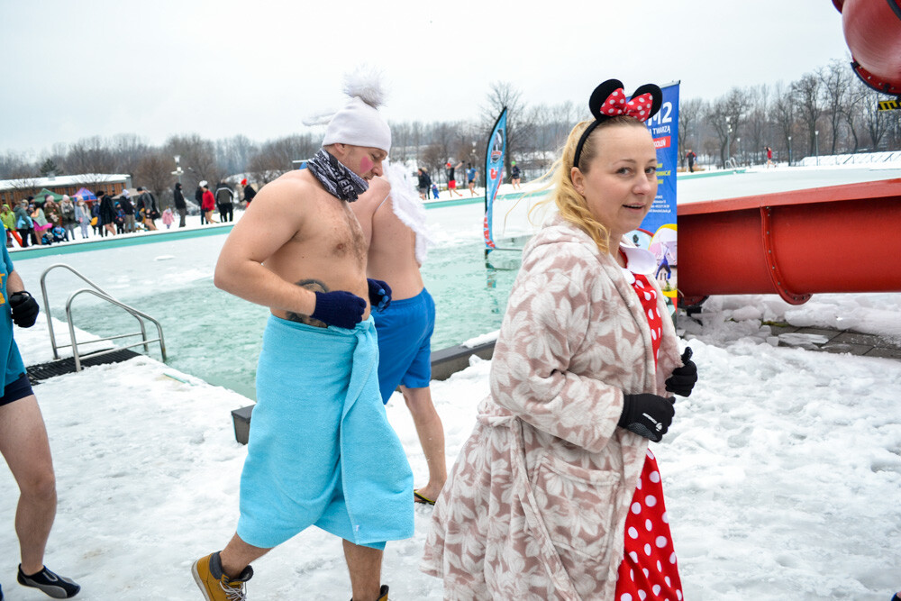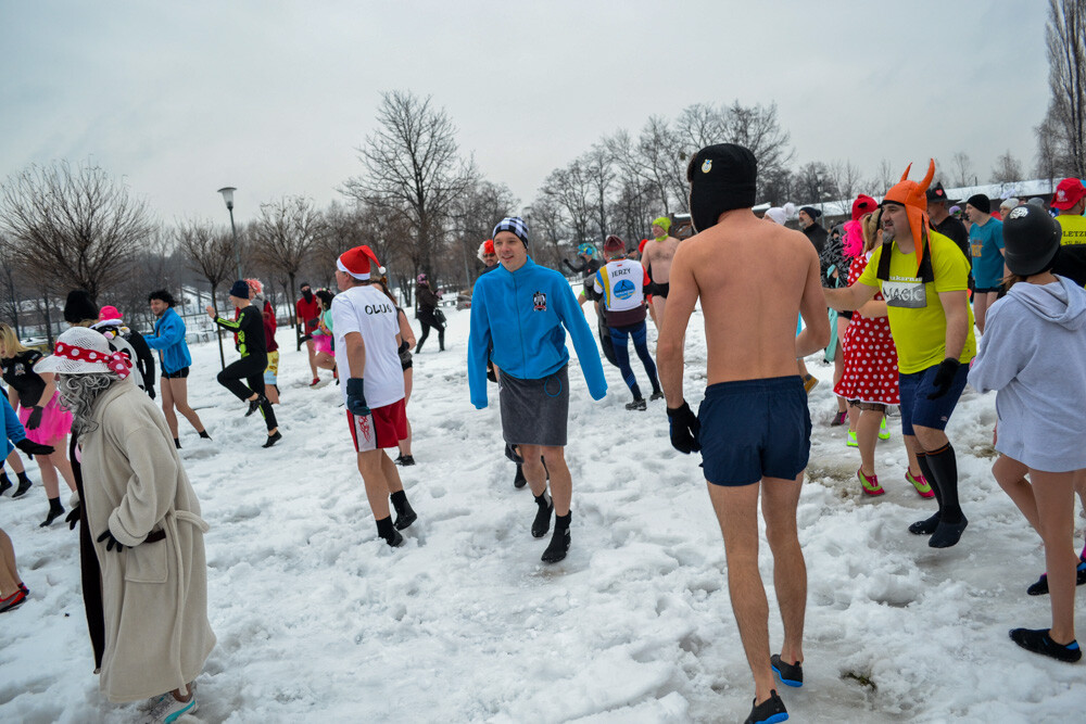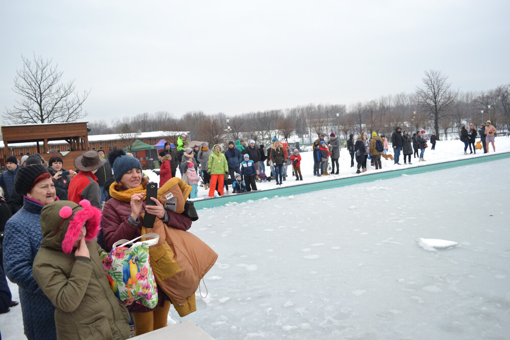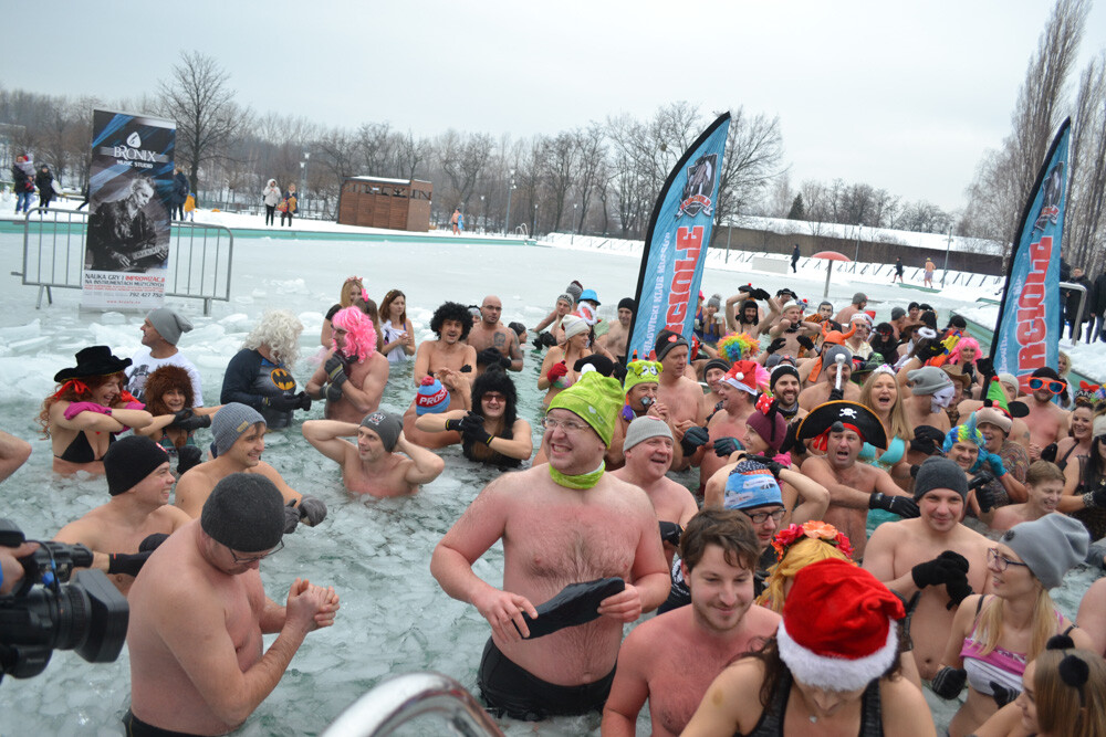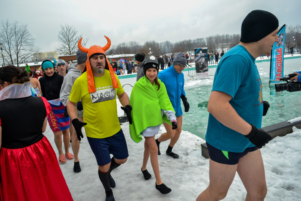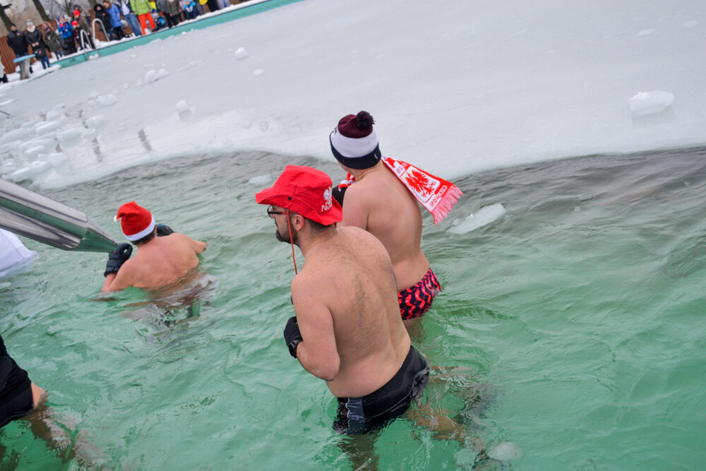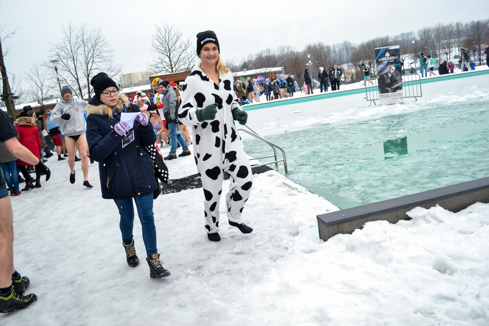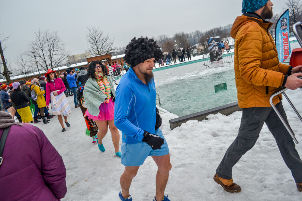 Około godziny 13 do jednego z basenów (wcześniej skuto na nim lód) weszło ponad 200 morsów, z prezydentem Danielem Begerem i grupą Harciole na czele. Pół godziny później podziwialiśmy walkę w wiosce wojów. Starli się ze sobą Rus i jeden z Normanów, którzy pojedynkowali się na topory bojowe.