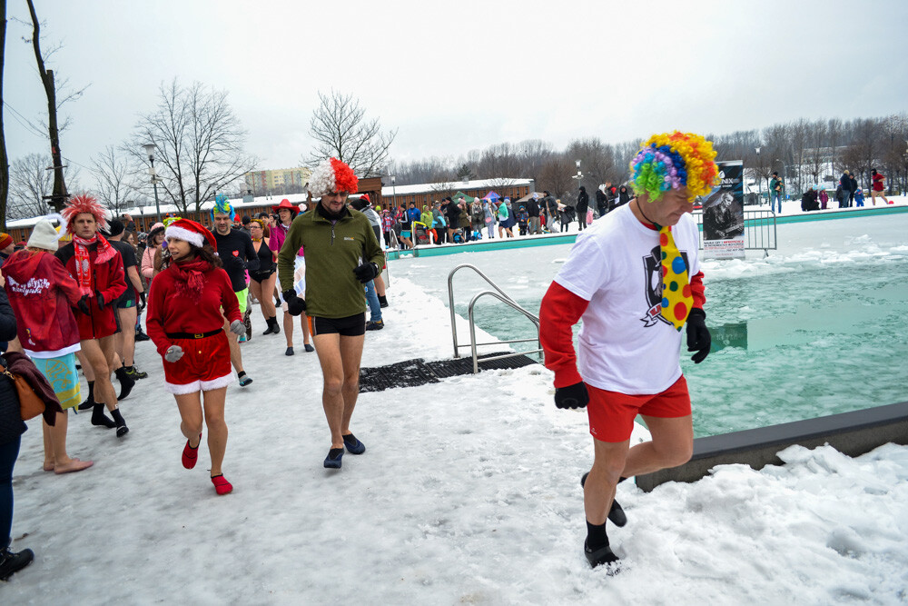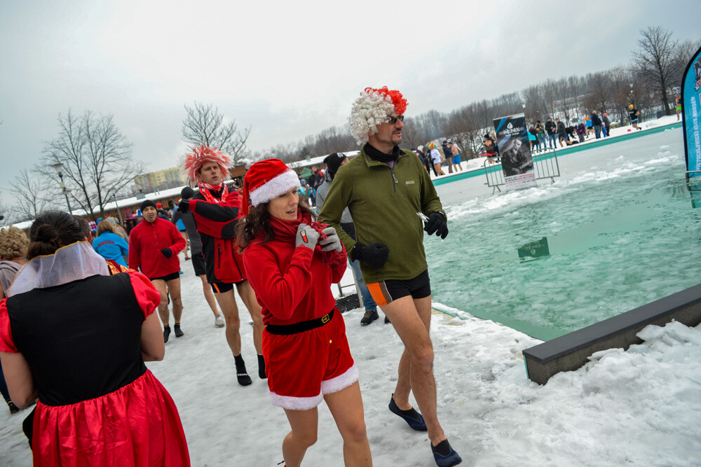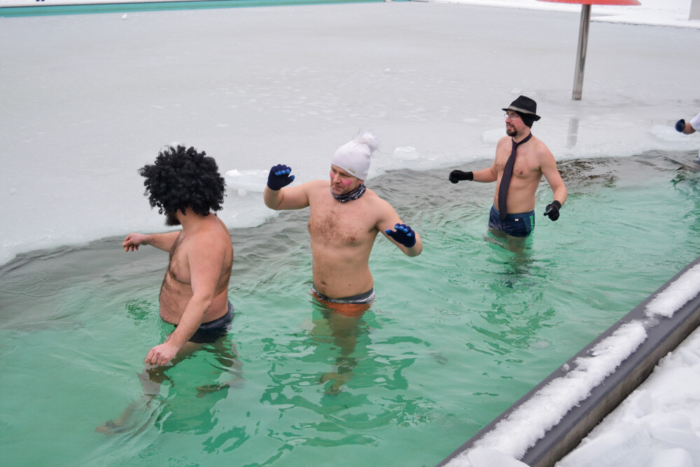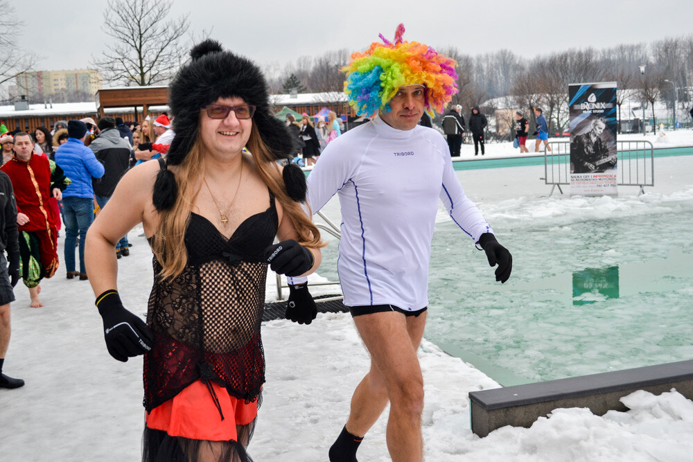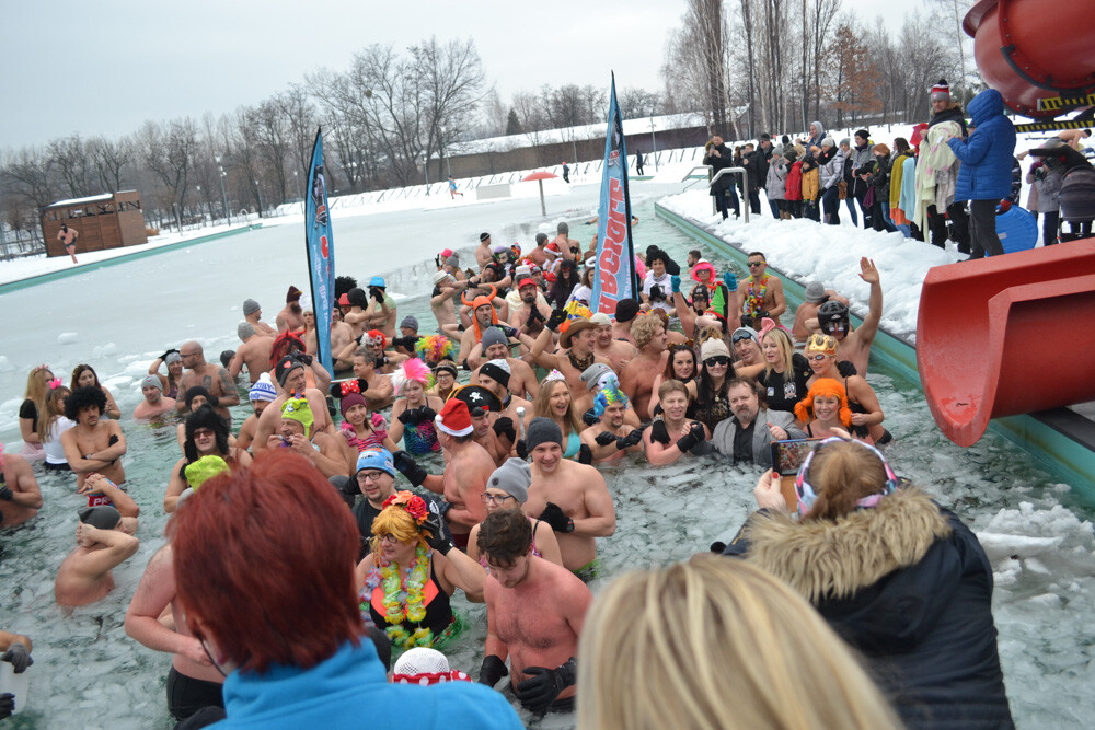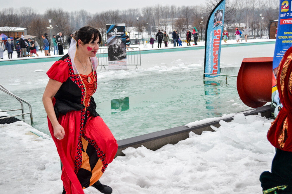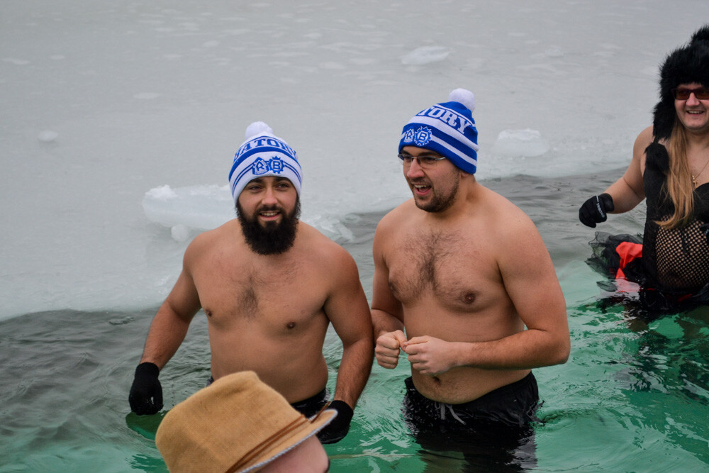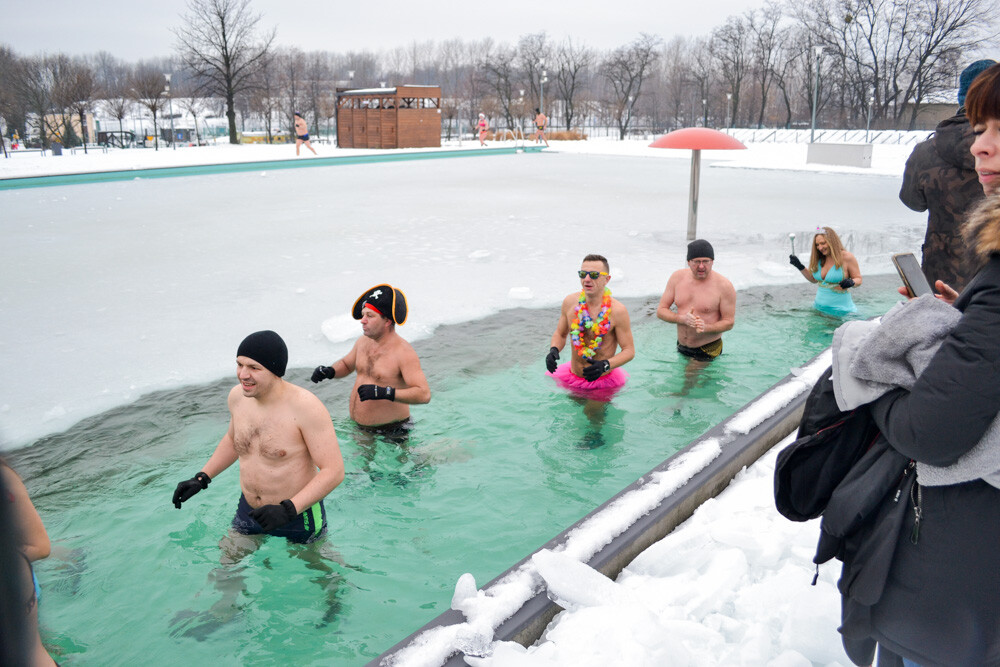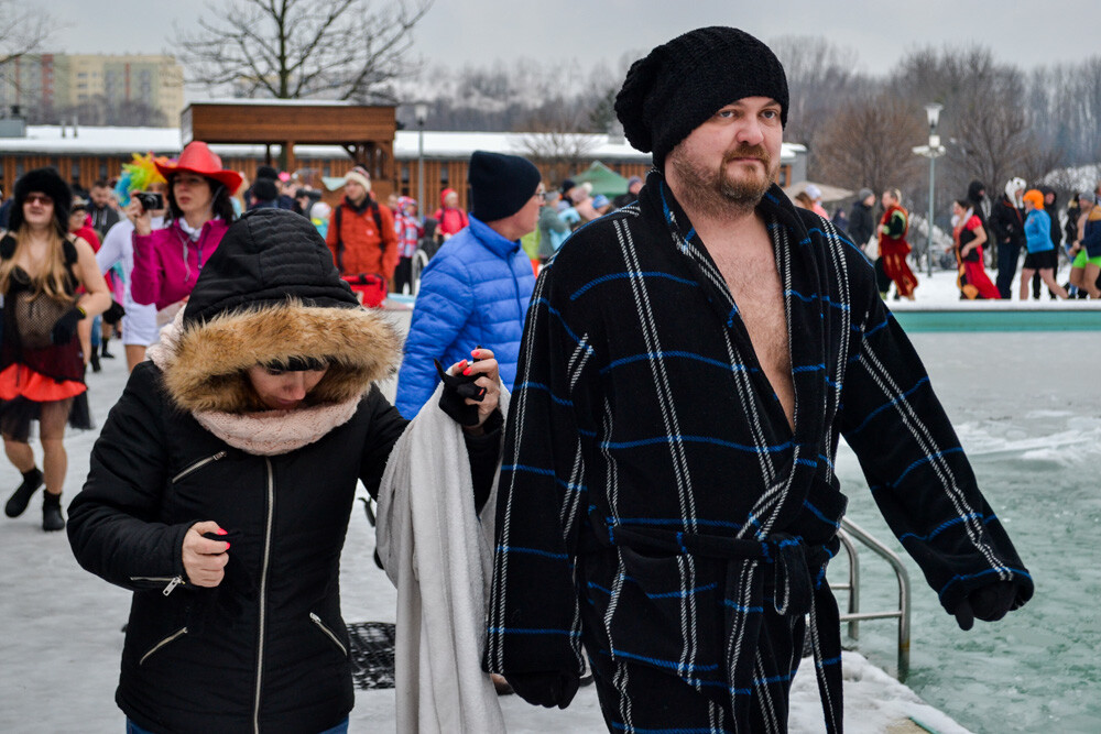 Około godziny 13 do jednego z basenów (wcześniej skuto na nim lód) weszło ponad 200 morsów, z prezydentem Danielem Begerem i grupą Harciole na czele. Pół godziny później podziwialiśmy walkę w wiosce wojów. Starli się ze sobą Rus i jeden z Normanów, którzy pojedynkowali się na topory bojowe.