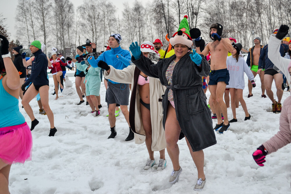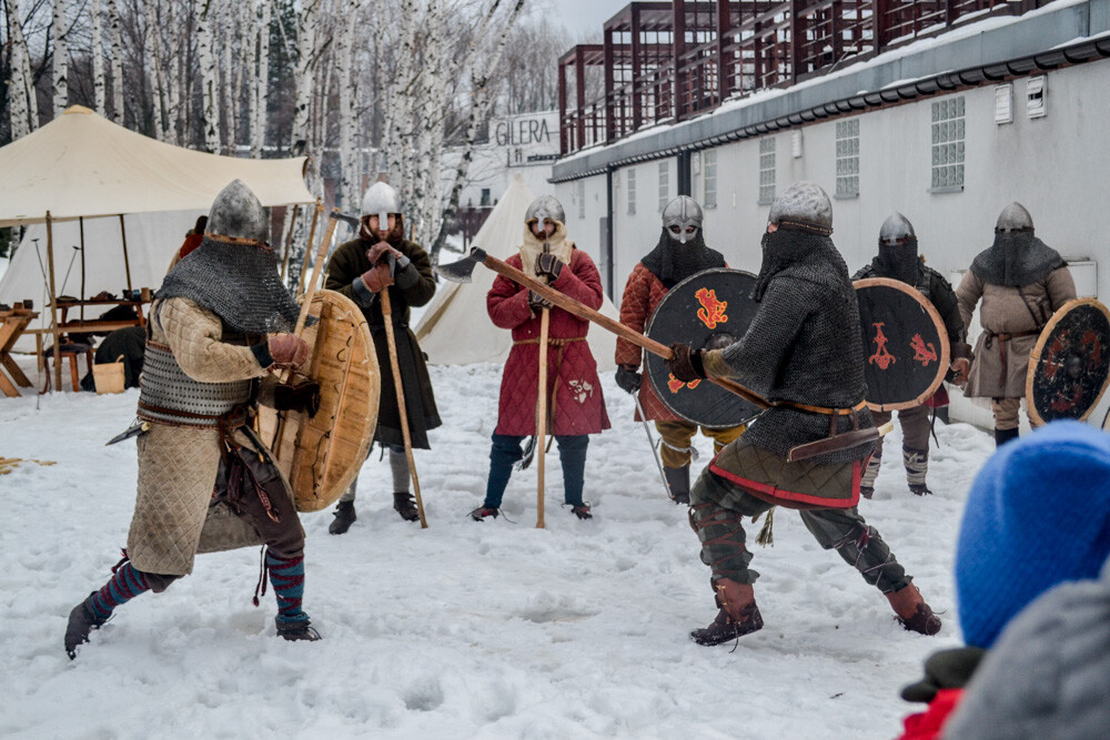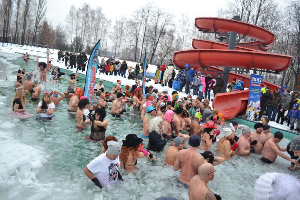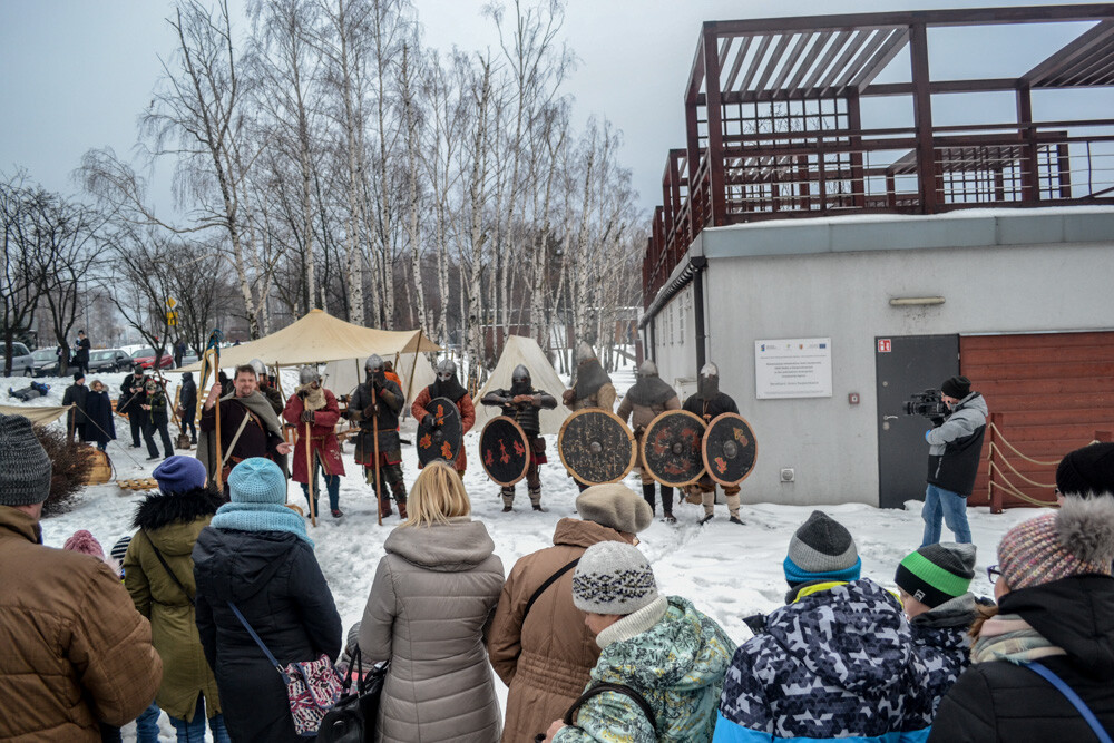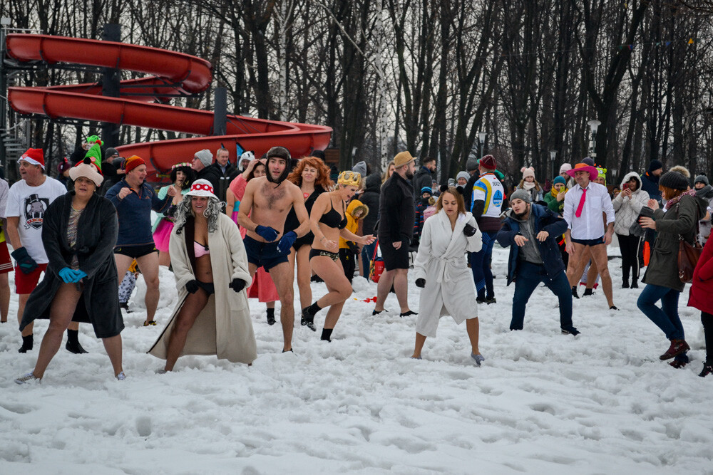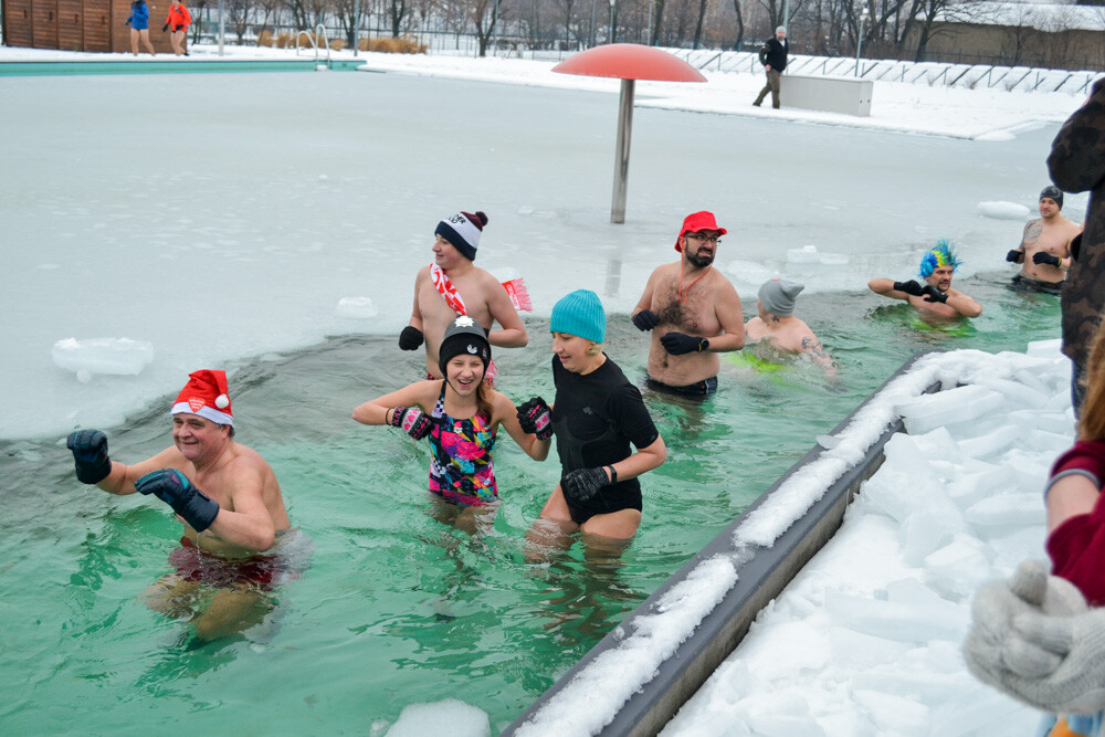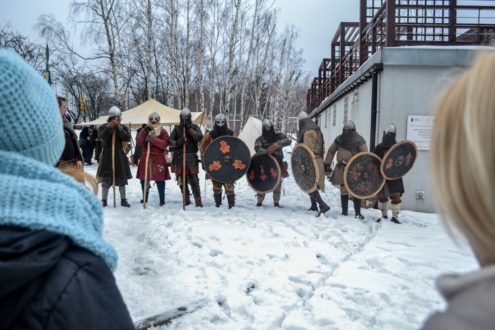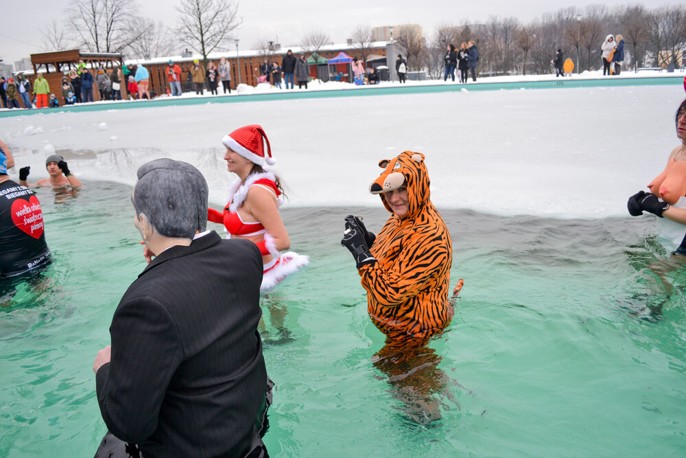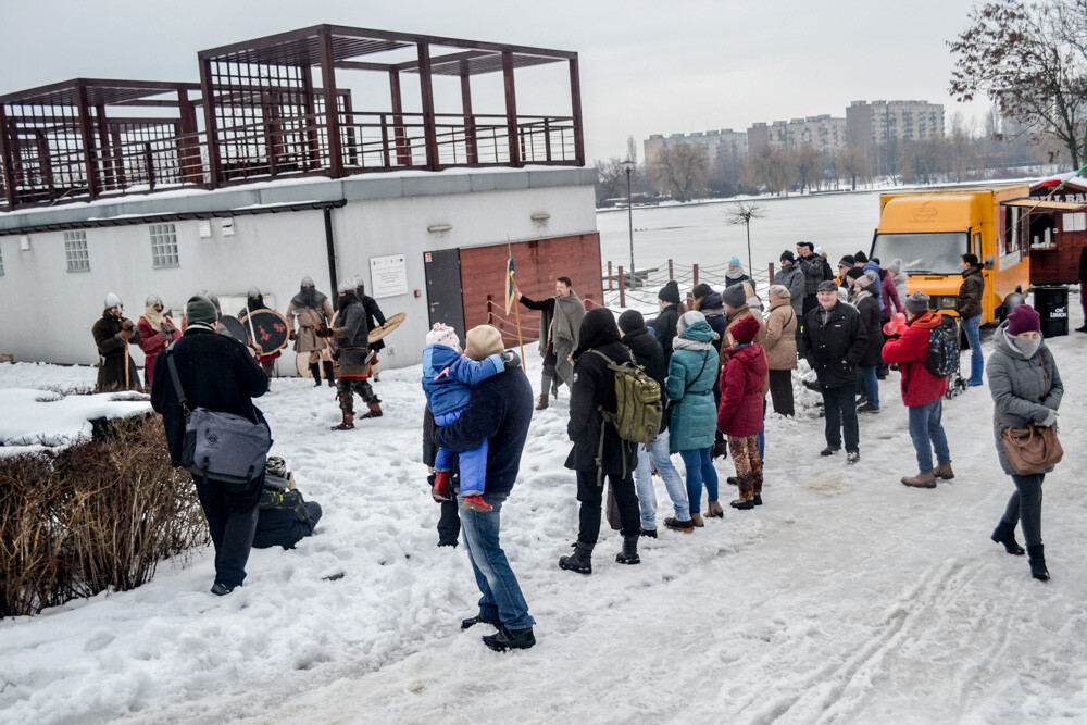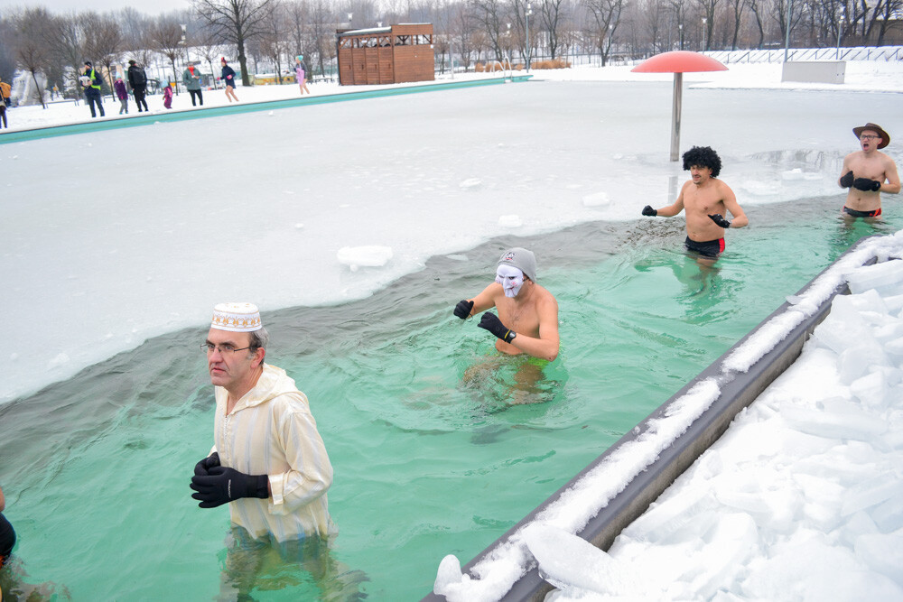 Około godziny 13 do jednego z basenów (wcześniej skuto na nim lód) weszło ponad 200 morsów, z prezydentem Danielem Begerem i grupą Harciole na czele. Pół godziny później podziwialiśmy walkę w wiosce wojów. Starli się ze sobą Rus i jeden z Normanów, którzy pojedynkowali się na topory bojowe.