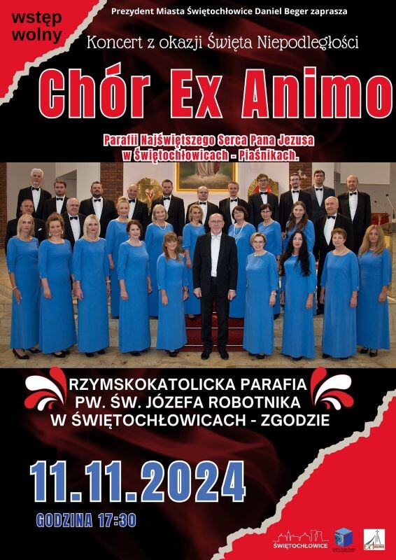 11 listopada br. świętochłowiczanie będą mieli okazję świętować Święto Niepodległości koncertem niezwykłego Chóru Ex Animo. Koncert odbędzie się w Parafii pw. św. Józefa Robotnika w Świętochłowicach - Zgodzie. Wydarzenie odbędzie się o godzinie 17.30 zaraz po wieczornej mszy świętej. To wyjątkowa okazja, by w dniu tak ważnym dla każdego Polaka wspólnie celebrować wolność i patriotyzm, wsłuchując się w wzruszające utwory w wykonaniu znakomitego chóru.
