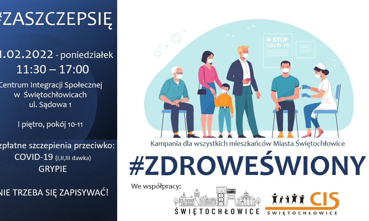W dniu 21.02.2022, tj. poniedziałek, w godzinach 11:30-17:00 w Centrum Integracji Społecznej przy ul. Sądowej 1 dostępne będzie bezpłatne szczepienie przeciwko Covid-19 oraz Grypie.