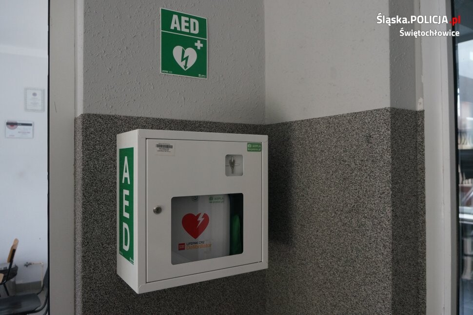 Defibrylator zwiększa szansę na przeżycie aż w 70 procentach przypadków osób, u których doszło do nagłego zatrzymania krążenia. Automatyczny Defibrylator Zewnętrzny umieszczono tuż przy wejściu, na parterze budynku świętochłowickiej komendy przy pokoju pierwszego kontaktu, tak aby w każdej chwili można było z niego skorzystać.