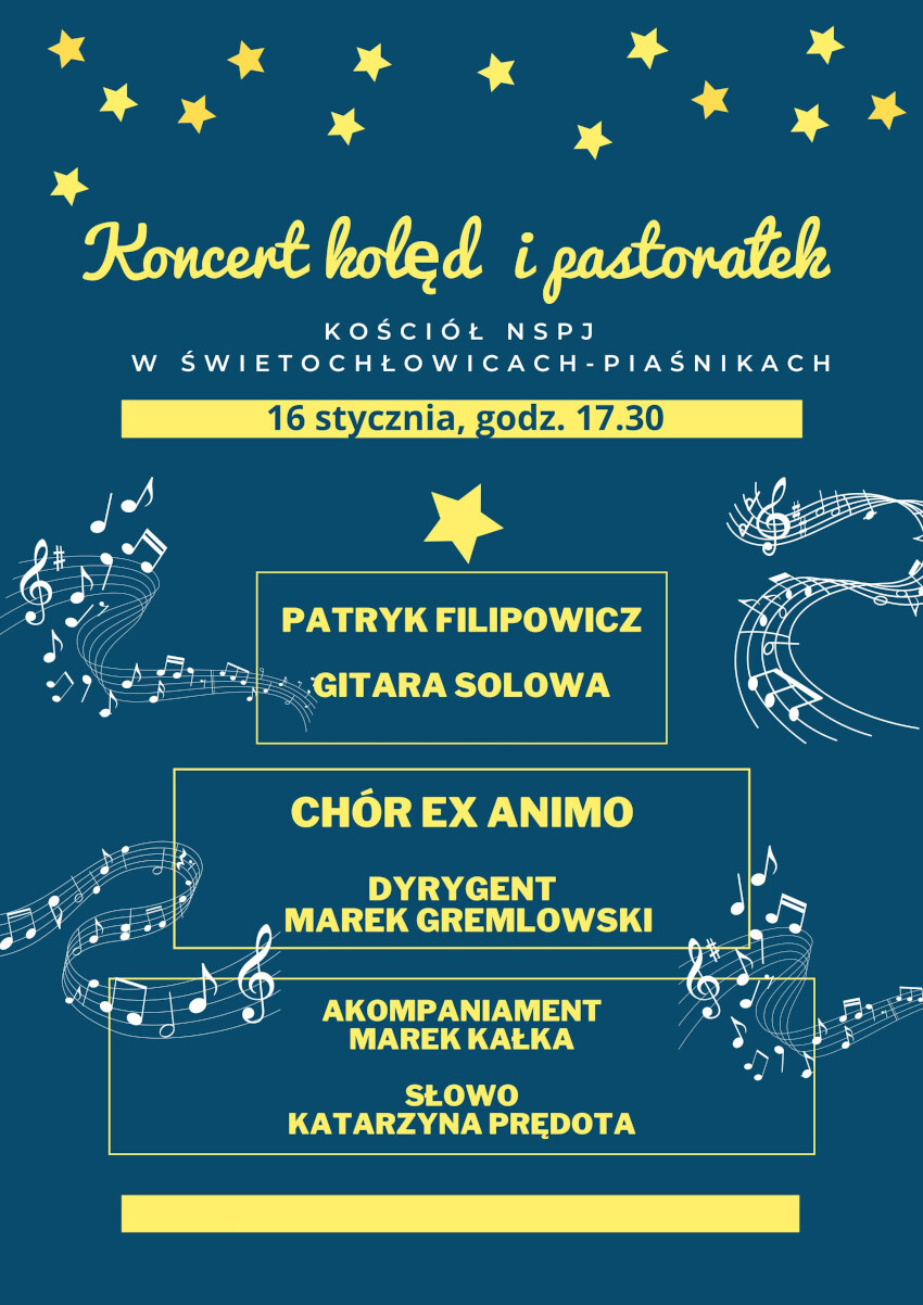 Serdecznie zapraszamy do wysłuchania koncertu kolęd i pastorałek w wykonaniu chóru Ex Animo Parafii NSPJ w Świętochłowicach-Piaśnikach oraz znakomitego śląskiego gitarzysty Patryka Filipowicza.
