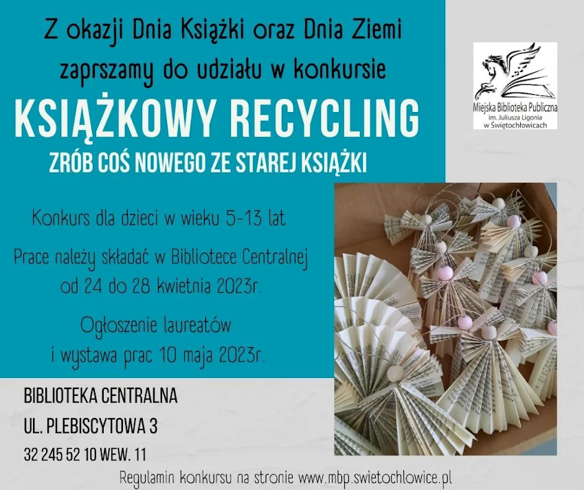 Miejska Biblioteka Publiczna w Świętochłowicach z okazji Dnia Książki oraz Dnia Ziemi organizuje konkurs plastyczny dla dzieci w wieku od 5 do 13 lat pt. "Książkowy recycling".