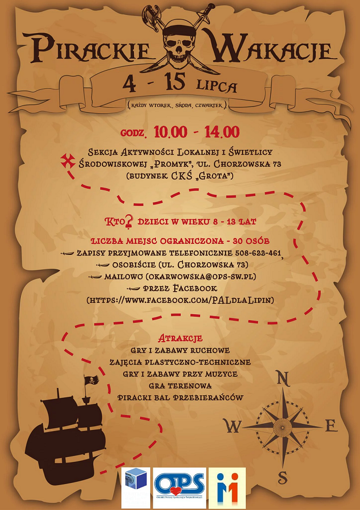 Sekcja Aktywności Lokalnej i Świetlicy Środowiskowej „Promyk” w Świętochłowicach od 4 do 15 lipca, w każdy wtorek, środę i czwartek, od godz. 10.00 do godz. 14.00 organizuje „Pirackie wakacje” dla najmłodszych mieszkańców naszego miasta. Z bezpłatnych zajęć mogą skorzystać dzieci w wieku od 8 do 13 lat.