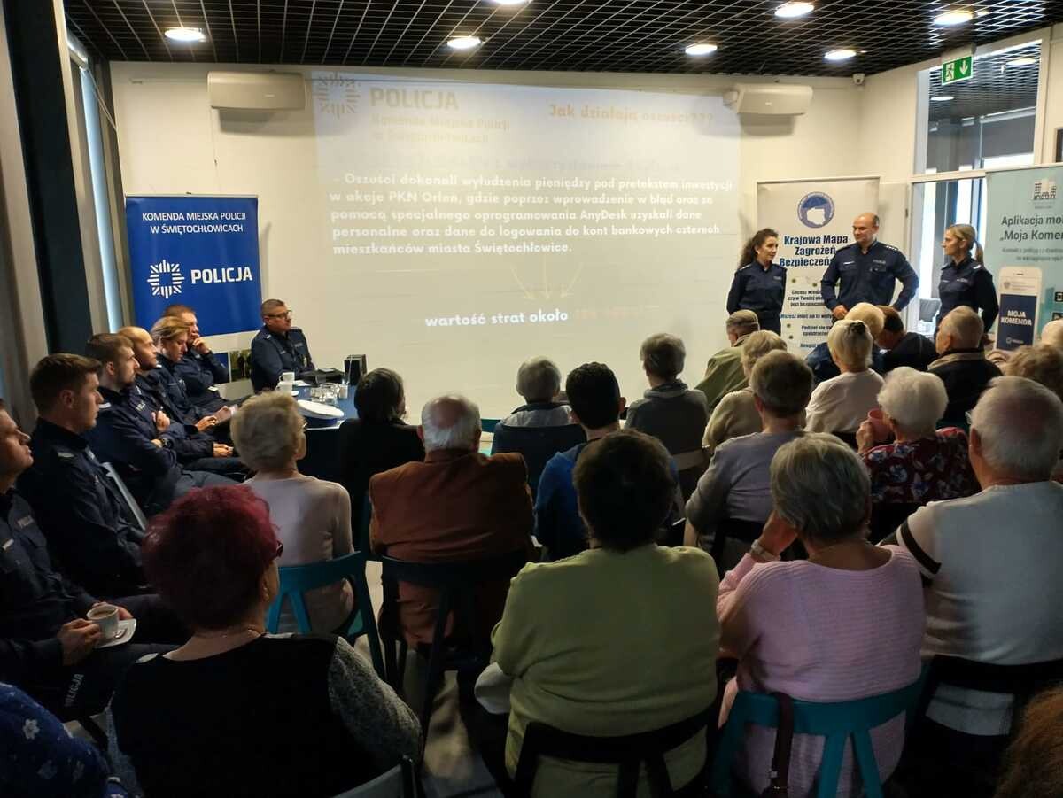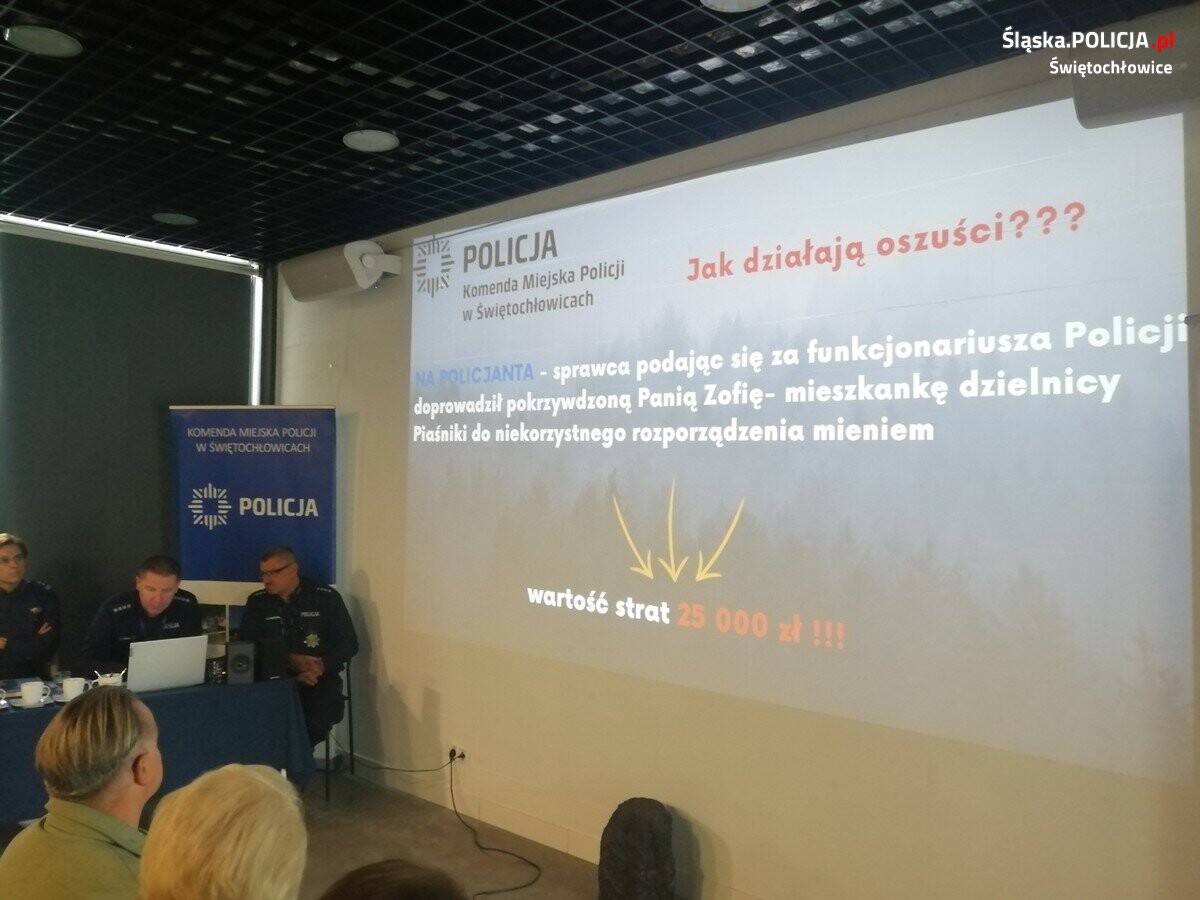 Policjanci ze świętochłowickiej komendy w miniony wtorek na terenie Wież KWK Polska spotkali się z seniorami zamieszkującymi miasto. Wszystko za sprawą zorganizowanej przez nich debaty społecznej. Zgodnie z jej nazwą „Bezpieczeństwo seniorów w życiu codziennym i w cyberprzestrzeni” głównym tematem spotkania było szeroko pojęte bezpieczeństwo osób starszych. Policjanci omówili problematykę oszustw dokonywanych na szkodę seniorów oraz ich bieżące problemy w tym zagrożenia i niebezpieczne sytuacje, na które narażeni są w codziennym życiu.