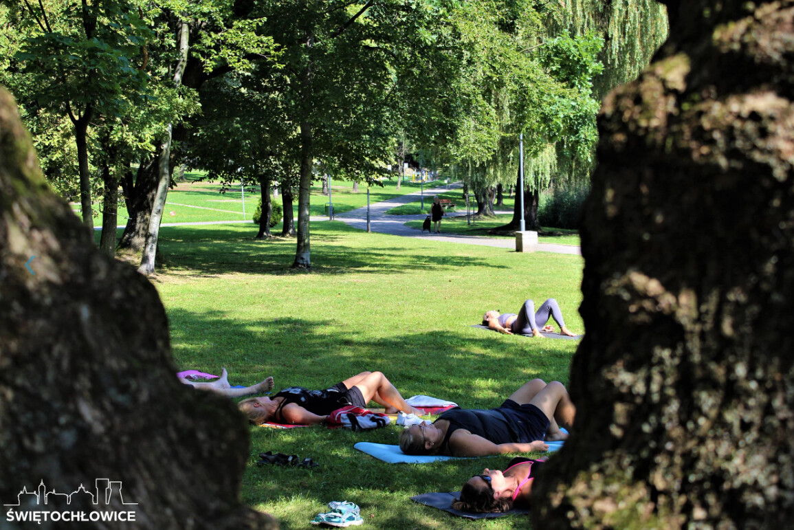 Seniorzy, którzy na co dzień uczęszczają na zajęcia z Holi Vitta w Młodzieżowym Domu Kultury w Świętochłowicach oraz w Centrum Integracji Międzypokoleniowej w Chorzowie tym razem spotkali się na wspólnych ćwiczeniach w plenerze.