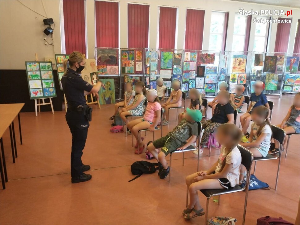 Wczoraj w świętochłowickim MDK, policjantka z miejscowej komendy odbyła spotkanie z dziećmi biorącymi udział w wakacyjnych zajęciach. Prelekcja mundurowej, była inicjatywą promującą bezpieczeństwo wśród najmłodszych w ramach akcji „Kręci mnie bezpieczeństwo�Ś nad wodą” oraz „Bezpieczne wakacje 2021”. Policjantka przypominała najmłodszym o tym, co jest najważniejsze dla ich bezpieczeństwa w trakcie letniego wypoczynku. Na zakończenie otrzymali od policjantów m.in. elementarz bezpieczeństwa.