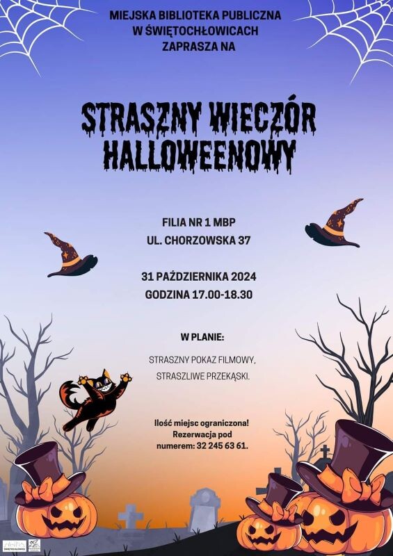 31 października odbędzie się "Straszny wieczór halloweenowy" w Filii nr 1 Miejskiej Biblioteki Publicznej w Świętochłowicach. Na dzieci w wieku od 6 do 12 lat czeka: straszny pokaz filmowy i straszliwe przekąski. Zabawa rozpocznie się o 17.00.