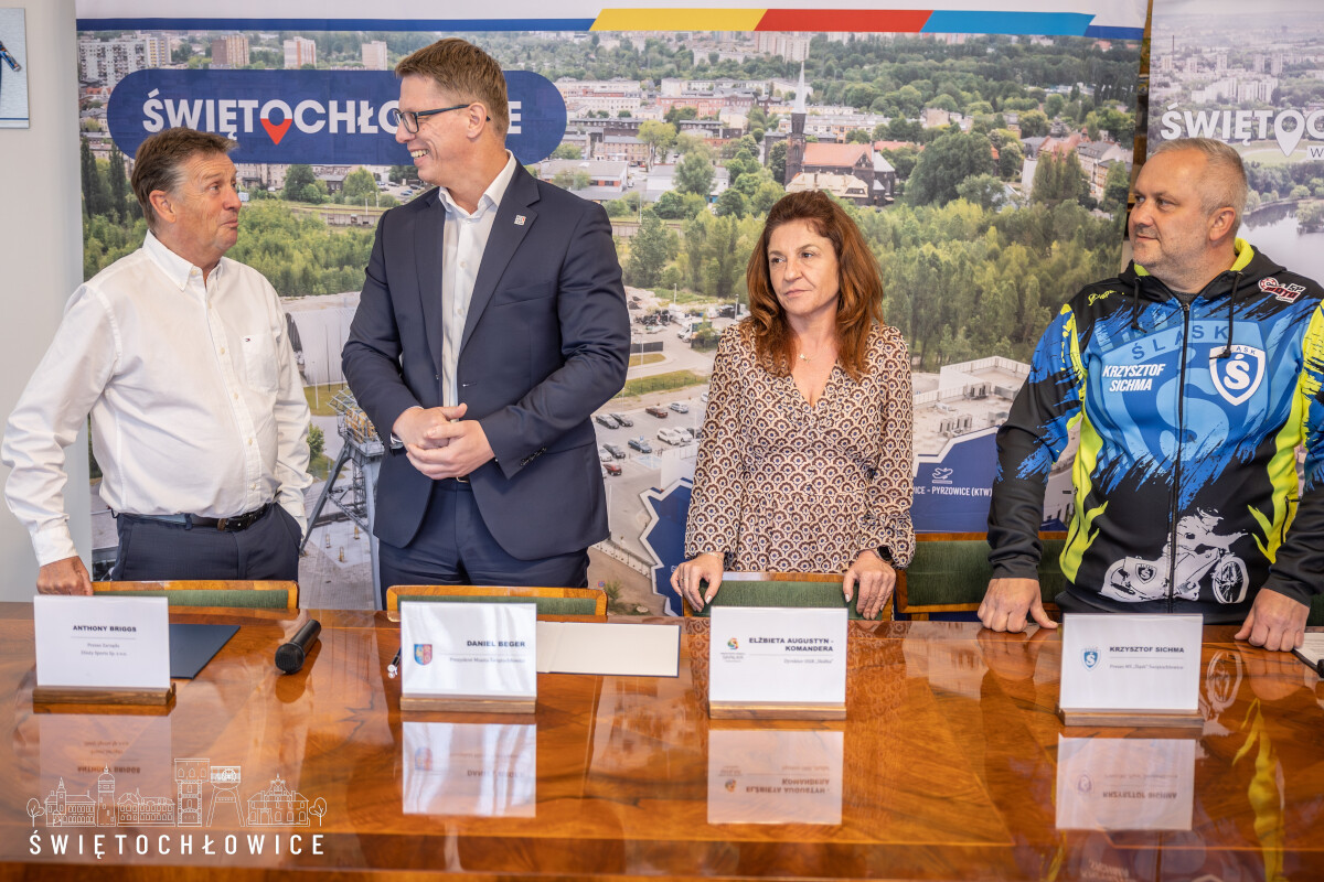 Chcemy, aby nasz tor żużlowy odpowiadał wymogom PZMOT-u, by móc organizować na nim poważne zawody. Wymogi związku motorowego jasno określają, że bandy wokół toru muszą być dmuchane, certyfikowane, z odpowiednią homologacją. Na takie wyposażenie podpisaliśmy właśnie umowę. Ma zapewnić bezpieczeństwo nie tylko trenującym, ale również zawodnikom, którzy będą uczestniczyć w organizowanych tu zawodach. Cieszę się, że przetarg wygrała firma założona przez byłego żużlowca. To odpowiednia osoba na odpowiednim miejscu, która zna się na rzeczy - mówi Prezydent Miasta Świętochłowice, Daniel Beger.