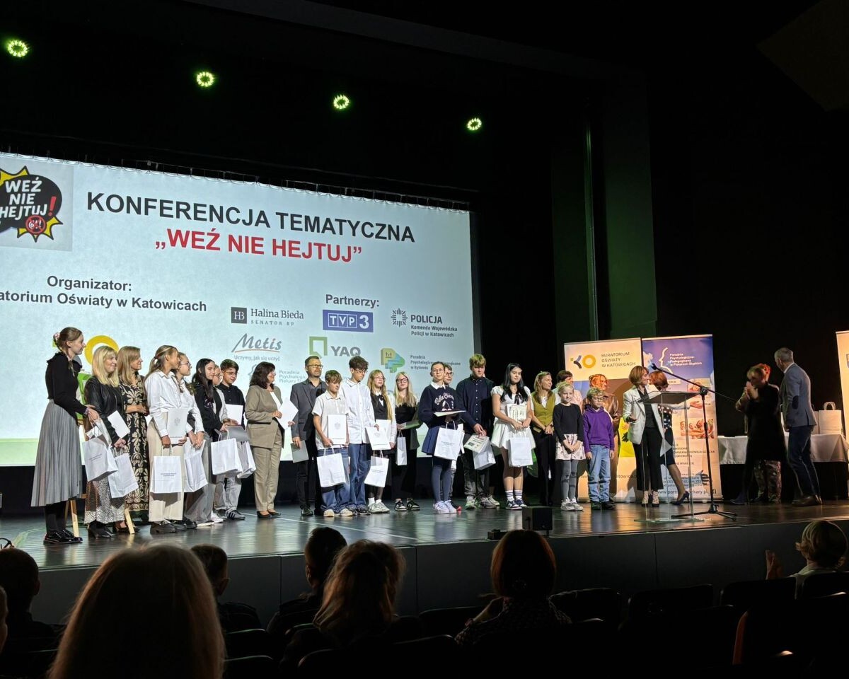 Uczniowie klasy 8a Szkoły Podstawowej nr 4 w Świętochłowicach godnie reprezentowali swoją szkołę i miasto podczas konferencji podsumowującej projekt „Weź nie hejtuj”, zorganizowanej przez Kuratorium Oświaty w Katowicach – Delegaturę w Bytomiu.