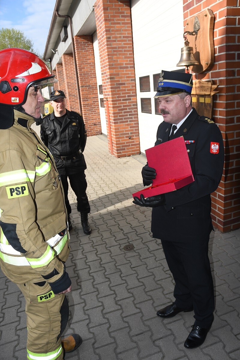 Zastępca Komendanta Miejski PSP w Świętochłowicach podziękował strażakowi za wieloletnią, wzorową służbę i pracę oraz wręczył pamiątkową tablicą.