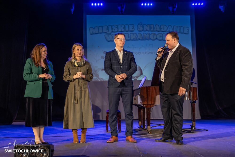 Spożywaniu tradycyjnego śniadania wielkanocnego towarzyszył program artystyczny, przygotowany przez wolontariuszy. Nie zabrakło również oczywiście świątecznych upominków! W miejskim śniadaniu wielkanocnym wzięły udział także władze miasta, w postaci prezydenta Daniela Begera i wiceprezydent Aleksandry Poloczek.