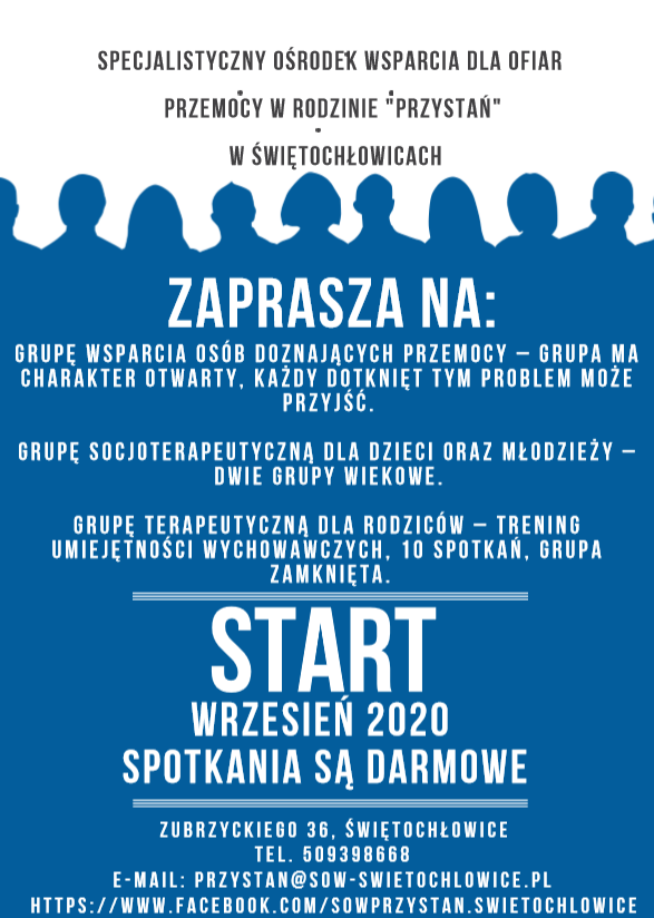 Specjalistyczny Ośrodek Wsparcia dla Ofiar Przemocy w Rodzinie „Przystań” w Świętochłowicach zaprasza od września 2020 r. na: